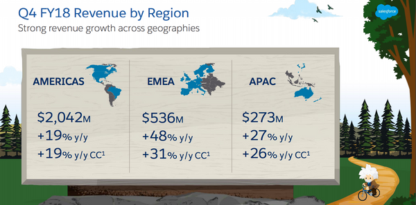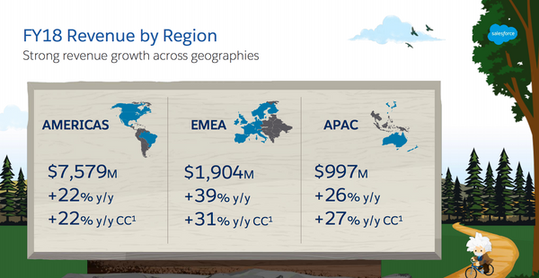 APAC represented 10% of global revenue for the fiscal year ending January 2018, which is consistent from the year prior. Overall, Salesforce pretty much obliterated analyst expectations.