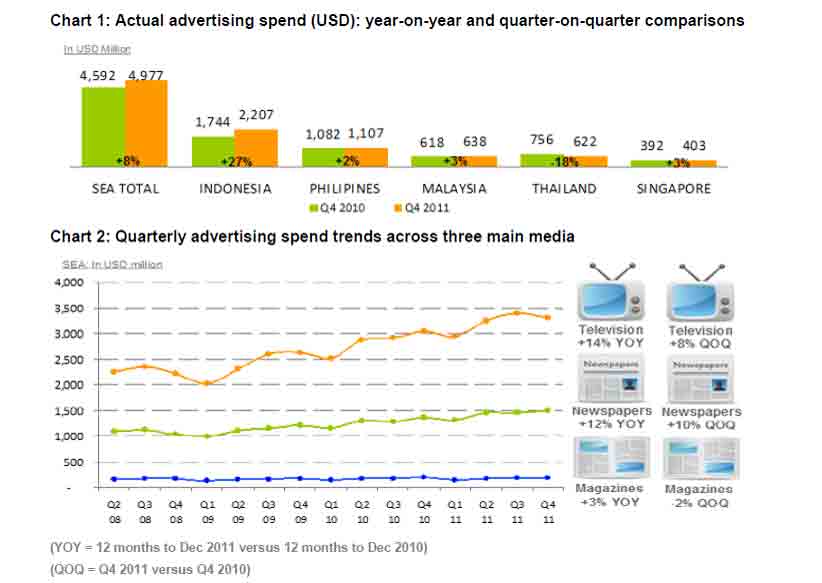 SINGAPORE - Advertising spend in Southeast Asia has recorded healthy growth across mainstream media last year, showing an annual growth of 13 per cent, according to the data released by Nielsen.
