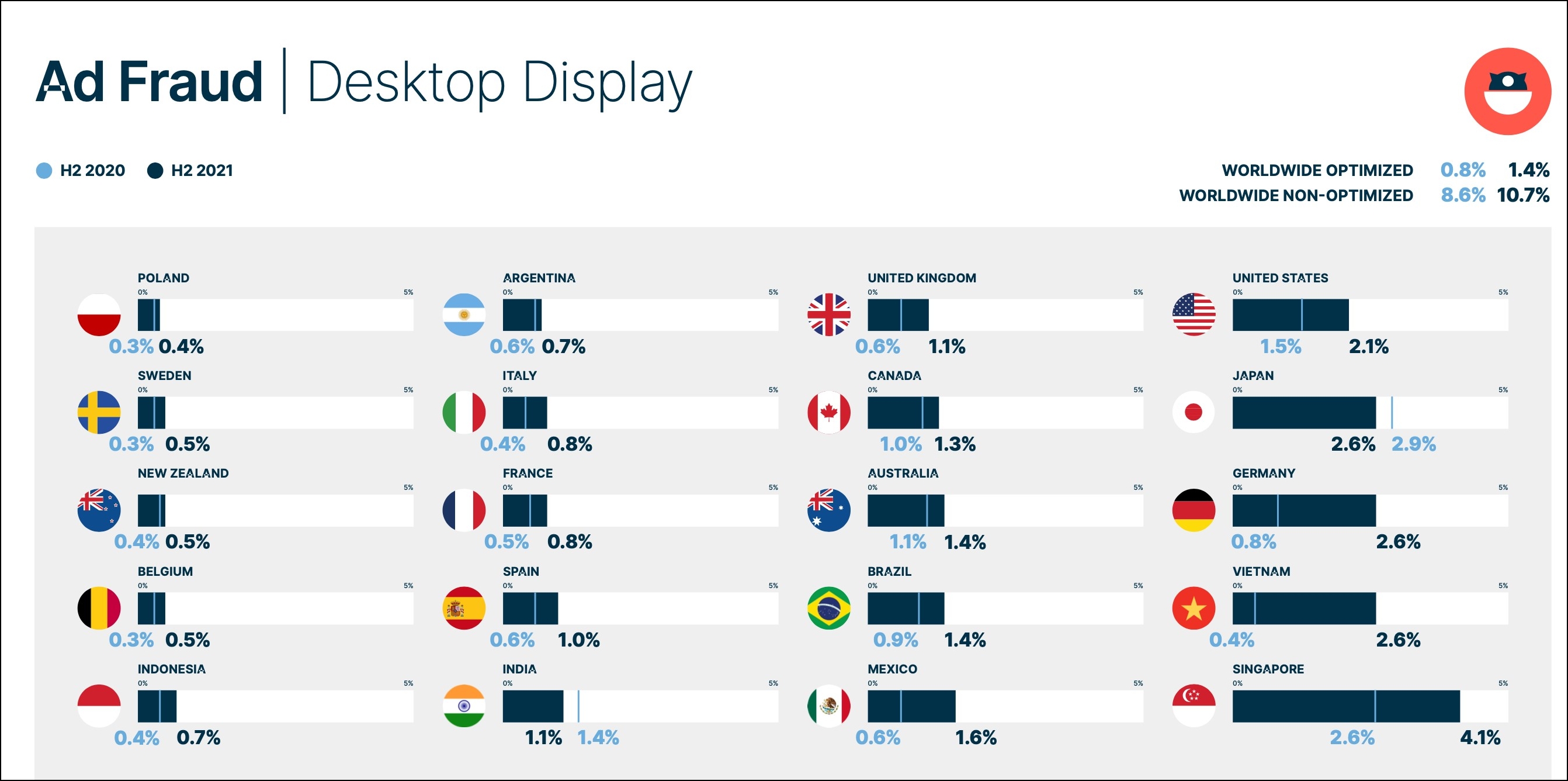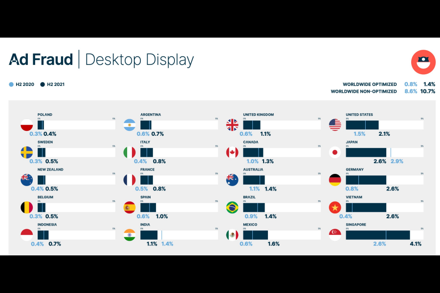 - After Singapore, the second highest desktop ad fraud rate was posted by Vietnam (2.6%) with Japan also at 2.6%, and Indonesia at 0.7%. India was the only market in the region that saw ad fraud rates reduce on desktop display to 1.1%.