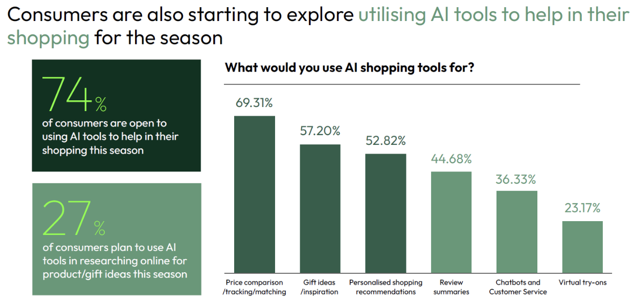 Price comparison is the most popular use (69%), followed by gift inspiration (57%) and personalised product recommendations (53%). Some are going further: 45% use AI to summarise reviews, 36% rely on chatbot assistance, and 23% experiment with virtual try-ons.