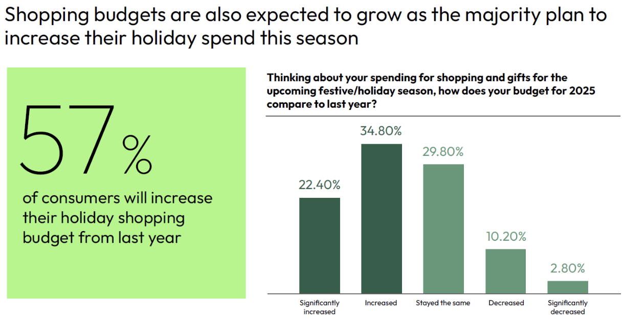 Holiday budgets are holding steady, if not growing. More than half (57%) of consumers report planning to increase their holiday budgets compared to last year, with around one in five (22%) indicating a sharp rise. In contrast, only one in 10 expects to cut back on spending, while nearly a third (30%) will maintain steady spend. For brands, this points to a resilient consumer base, where budget is growing, suggesting opportunities to leverage AI tools such as generative engine optimisation in the festive season, where many brands will be competing for consumer attention.