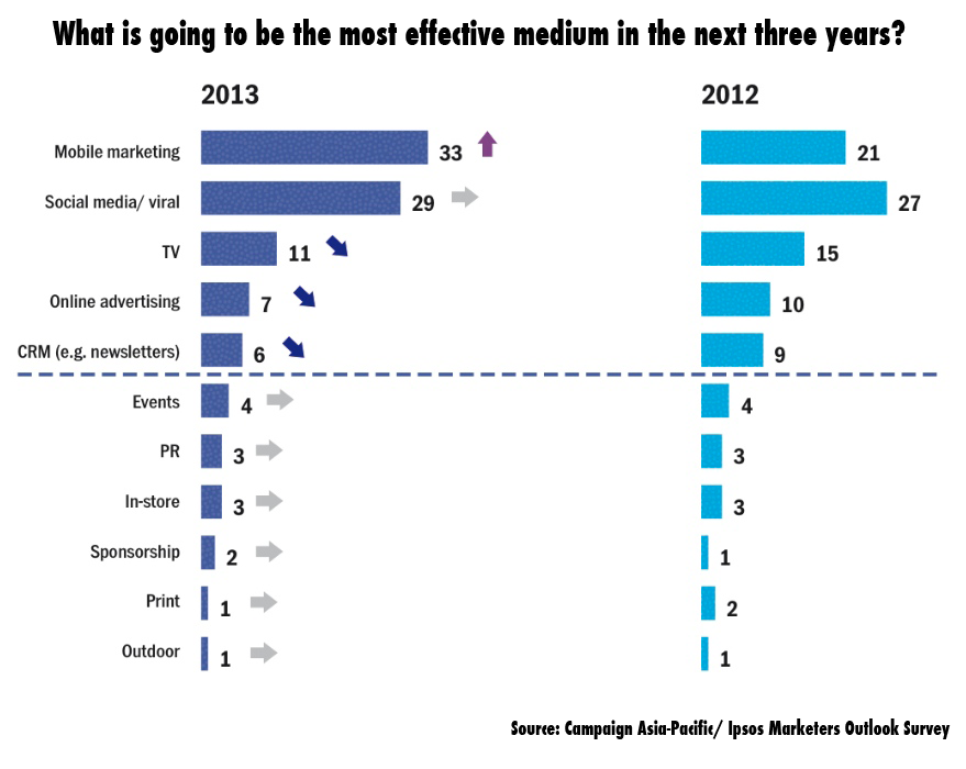 In case you thought there was any room for debate, mobile was the only approach that gained popularity from the previous year. TV, online advertising and CRM all lost lustre in the eyes of marketers, while other options simply stayed flat year on year (see chart below). Individual conversations with agency heads also indicate that finding ways to take advantage of the mobile trend for marketing purposes is top of mind throughout the region.