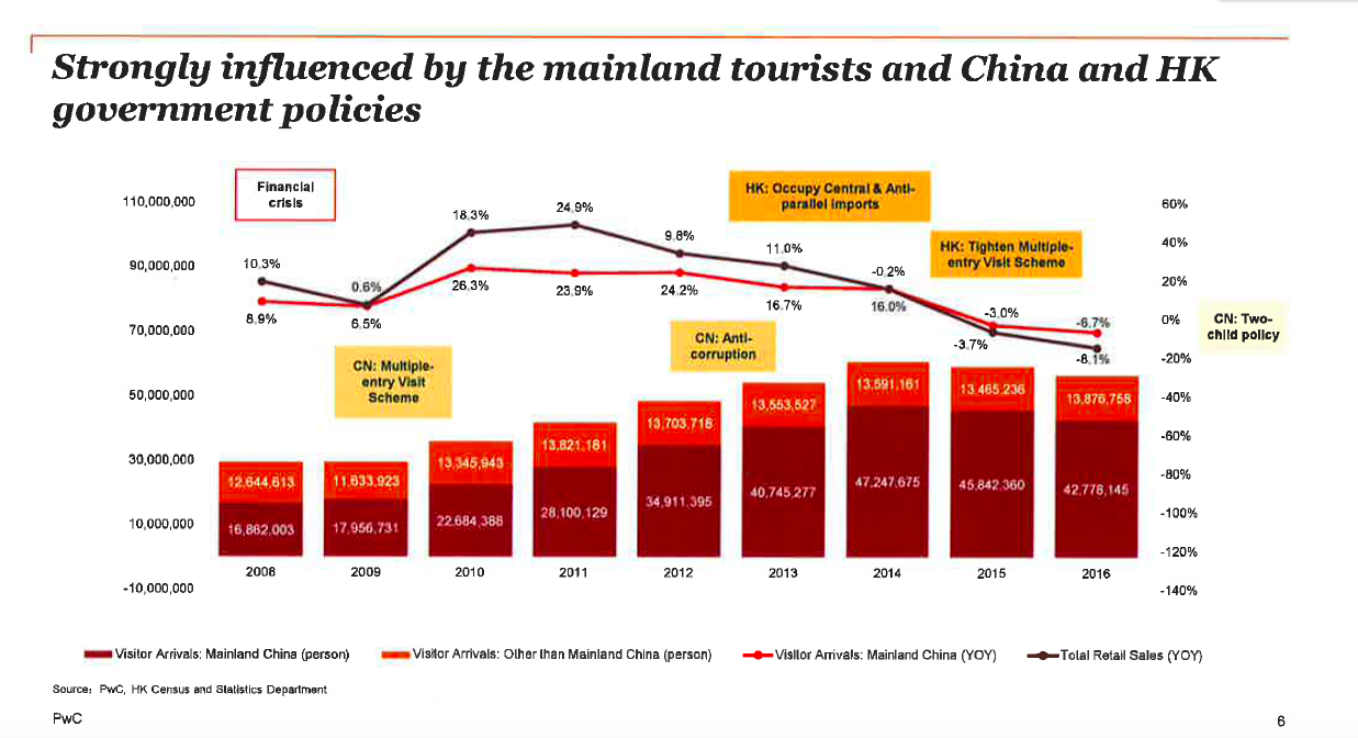 In Hong Kong, 2016 was the most difficult out of the last seven years for retail, with an 8 percent decrease in sales. However, Michael Cheng, retail and consumer leader with PwC Asia Pacific and Hong Kong/China, said retailers can expect the market to bottom out in 2017 and recover gradually, with better economic prospects and a rebound in the number of mainland tourists. The value of total retail sales in March this year increased by 3.1 percent year-over-year, marking the first increase after 24 months of continuous declines since March 2015.