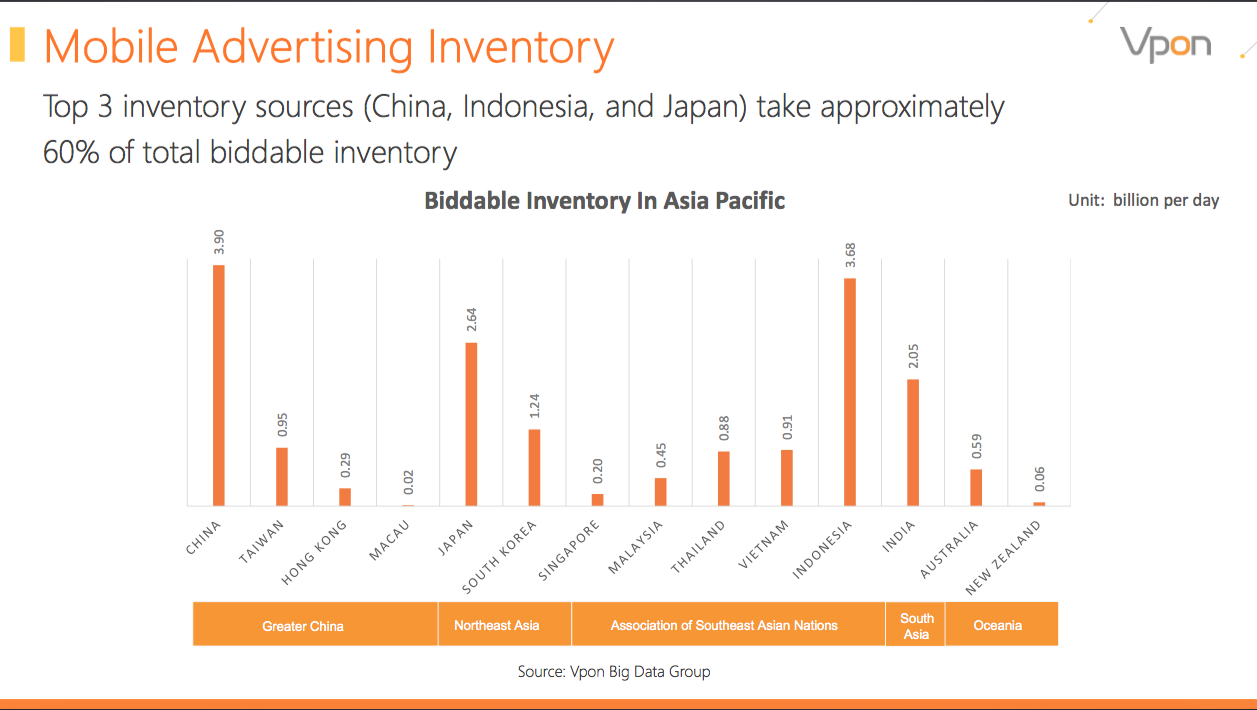 China is the largest market for programmatic mobile ads in Asia, with up to 3.9 billion daily biddable traffic, followed by Indonesia and Japan. These three countries now account for nearly 60 percent of all biddable traffic in Asia.