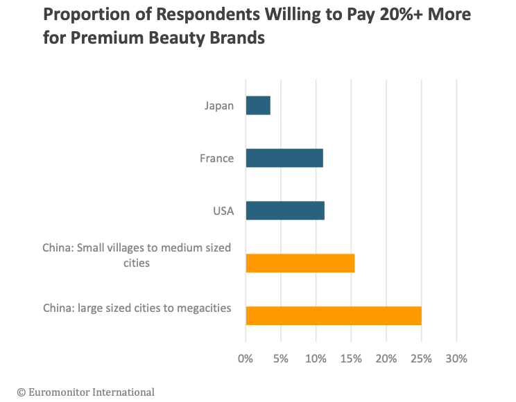 When it comes to shopping growth, China’s high-tier cities have far exceeded those in developed countries such as Japan, France, and the US. This is partly due to a consumer willingness in those cities to pay a significant premium for quality goods, says the report. In a chart comparing different countries, China’s small villages, medium-sized cities, large cities, and megacities show that between 15 and 25 percent of respondents were willing to pay over 20 percent more for premium beauty brands.