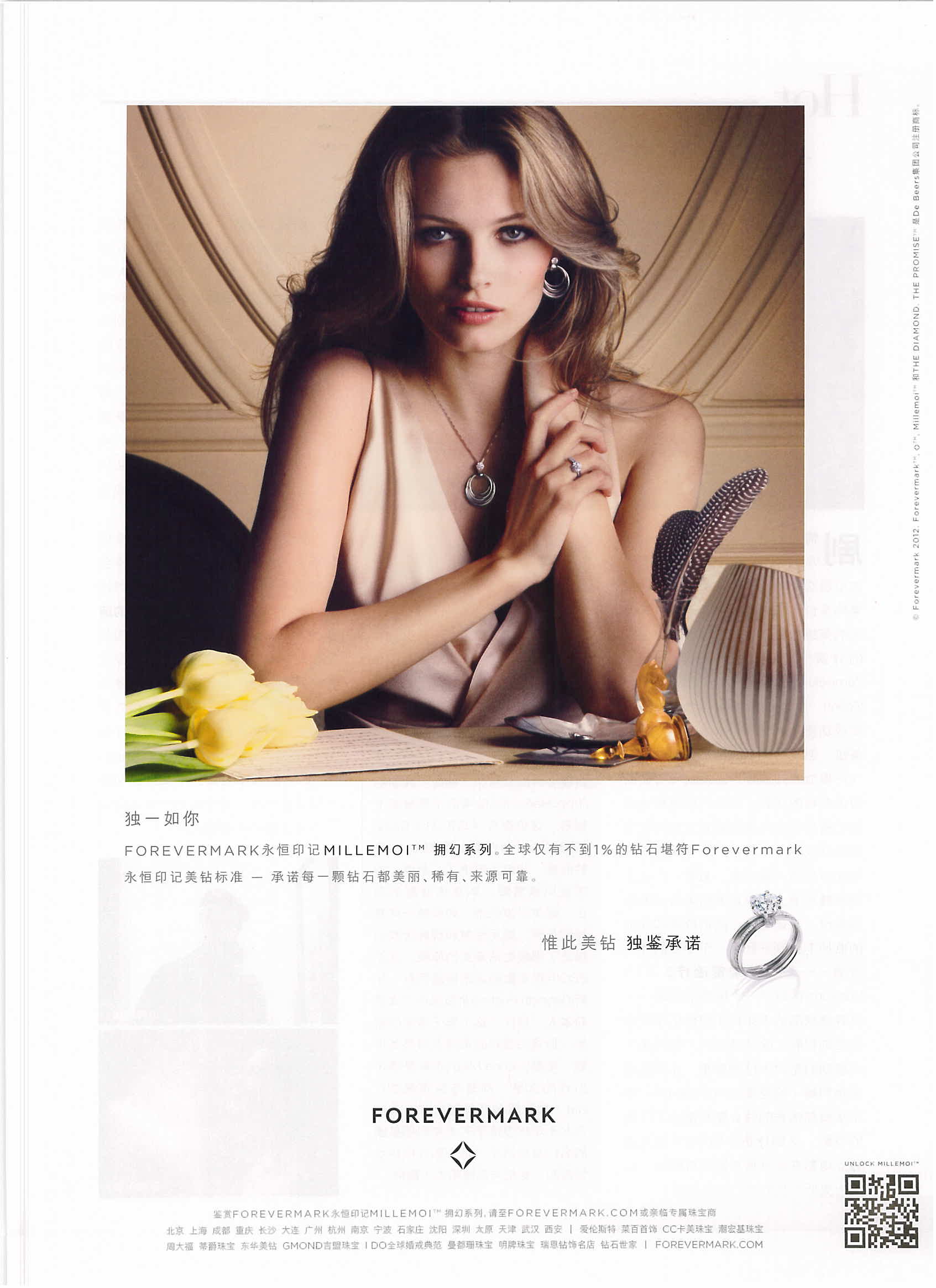 Lithuanian supermodel Edita Vilkeviciute promotes the Forevermark brand of diamonds in this ad. It scored the highest for readers who noted the ad and also clipped it from the magazine. Moreover, 13% of readers who noted the ad also used a mobile device to activate the ad’s QR code.