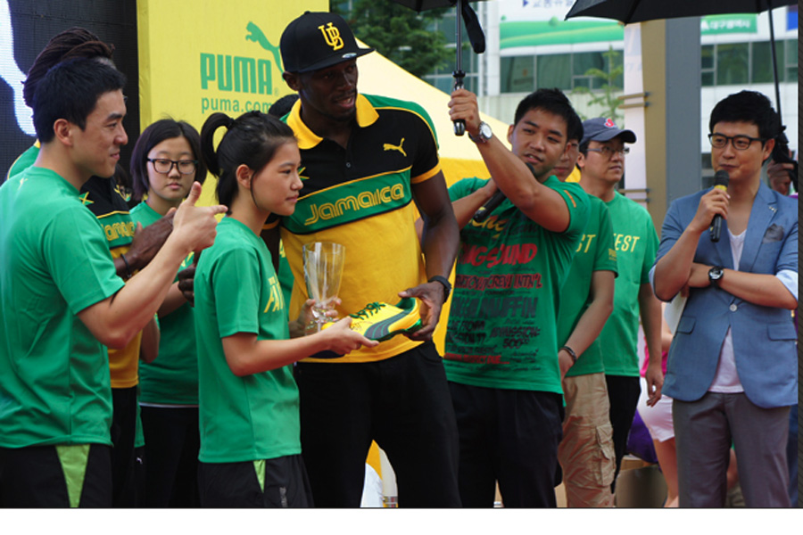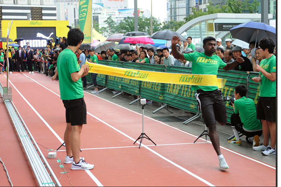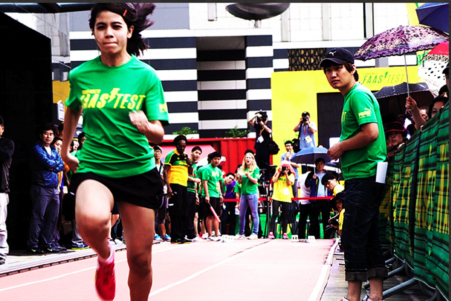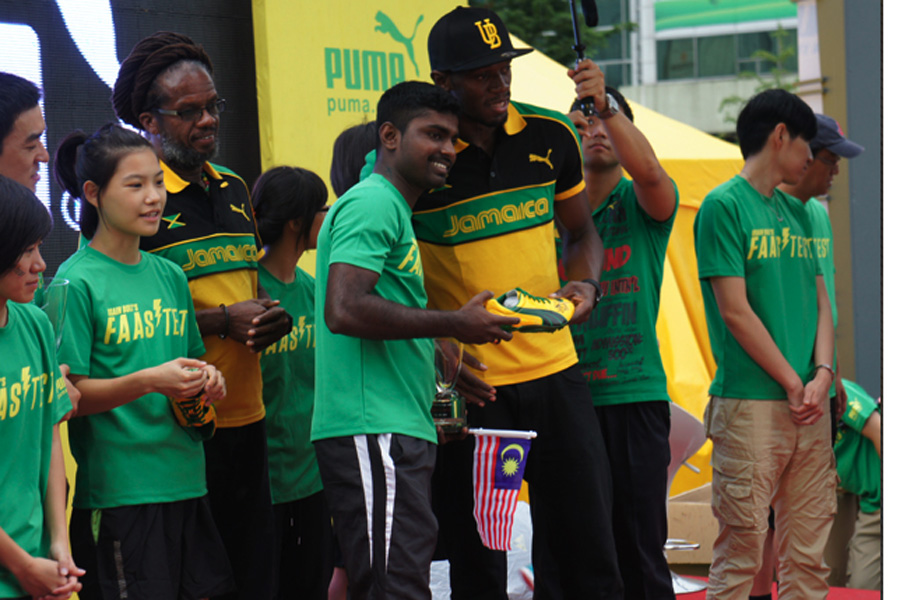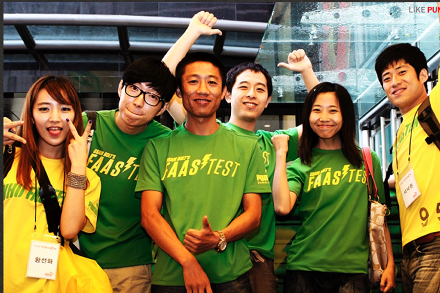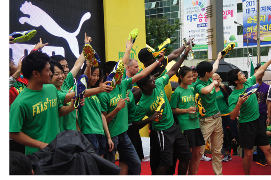 Usain Bolt, the world's fastest man, was in Daegu, South Korea on 20 August, before he competed in the IAAF World Championship there, he helped to crown the winners of the Puma Faas Test Final, a unique street-sprinting challenge where 16 finalists from six countries in the region raced against Bolt's own 100m speed record. The final winners were from Malaysia and Korea who got to meet and chat with their idol and brought home Bolt's autographed Puma running spike shoes and trophy.