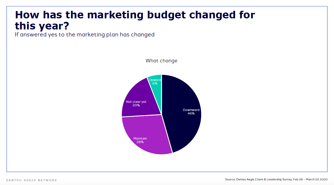 While one might easily make the case to ramp up marketing efforts (and surely many CMOs will be) to make up for lost sales, 46% of DAN clients say their marketing budgets have been revised downwards for the year, with another 20% unclear as to how their budgets will be affected.