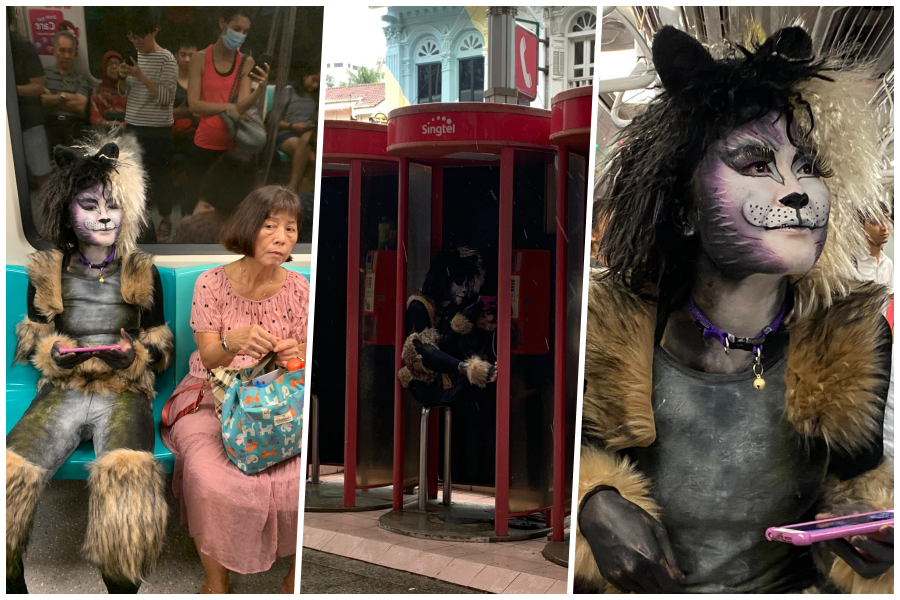 The 'cat' has been travelling on the MRT and has even take a pit stop in one of Singtel's phone booths: