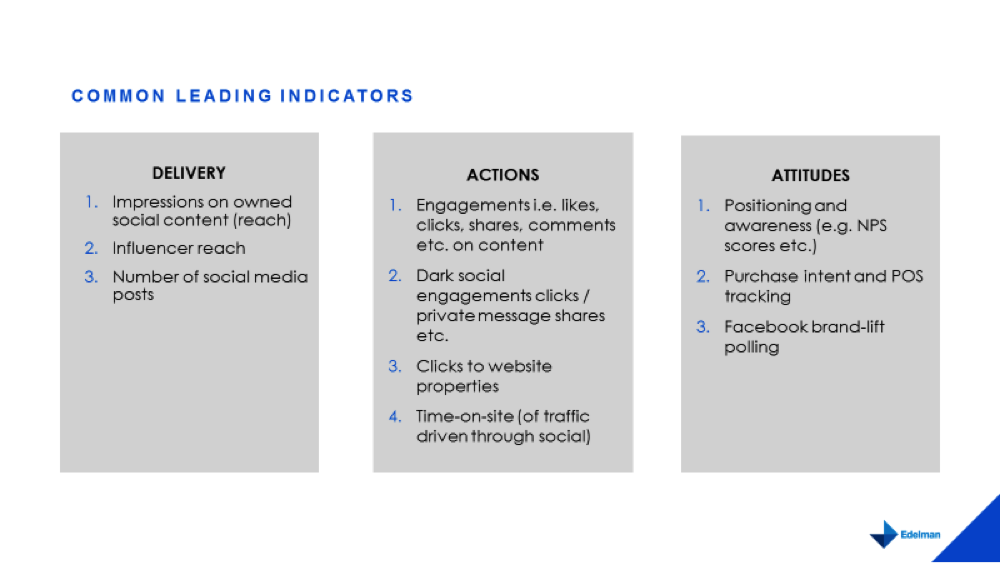 Marketers need to go back to basics, and treat social media as media. Below is a list of leading indicators you may want to start with. The ‘Delivery’ and ‘Action’ column is where most marketers are focused.