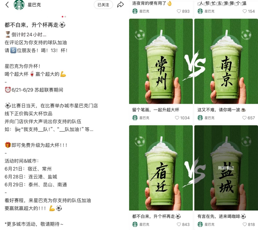 She mentioned "the hype during June of 2025 surrounding the Jiangsu Provincial City Football League, where football was transformed into a celebration of local identity, grassroots participation and friendly city-level rivalry". Starbucks seized this moment to introduce city-themed drinks, encouraging fans to cheer for their hometown teams on Xiaohongshu and in stores and offering perks like free size upgrades for customers who support their city’s team.